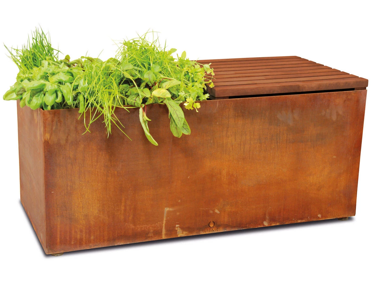 Con el Banco de Jardin con Huerto Urbano usted podrá disfrutar de un momento de descanso cerca de su barbacoa Ofyr. El banco está fabricado de madera de haya térmica, es un asiento cómodo y puede moverse a los dos lados, esto nos permite colocar plantas al lado contrario del asiento. La base está fabricada en Acero Corten lo cual hace que sea muy estable.