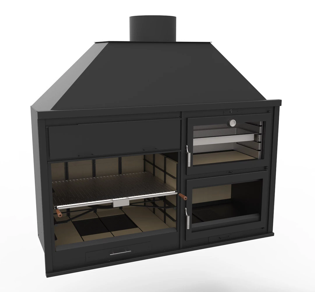 Fabricada enteramente en Acero al carbono de 4 mm. y con puertas de fundición. Además incluye un soporte de paellera con una capacidad de hasta 65 cm. de diámetro.