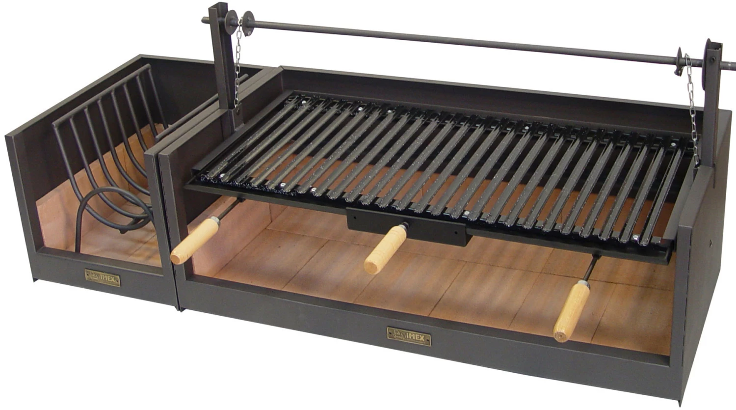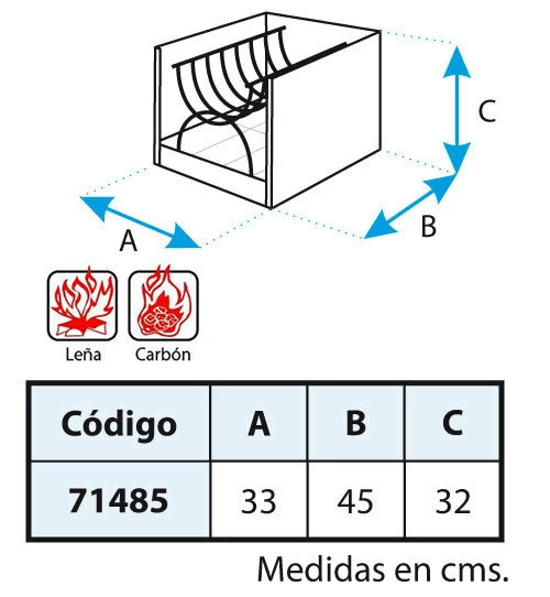 Cajón fabricado en hierro forjado con pintura resistente a 800 ºC, soporte para la leña y base de ladrillo refractario.