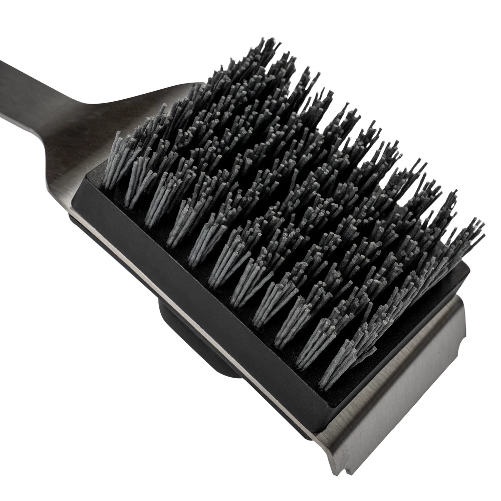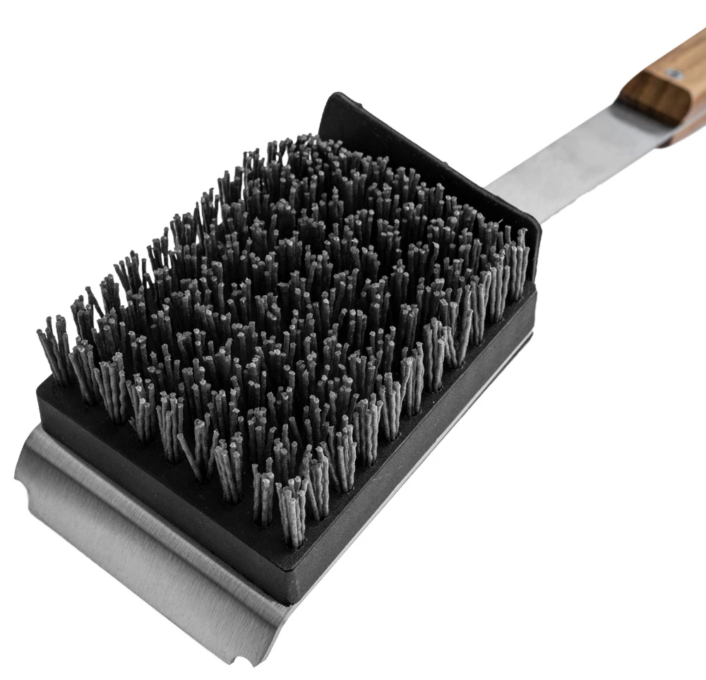 Presentamos una forma más segura de limpiar las parrillas en frío. El cepillo de limpieza para barbacoas de la marca Traeger cuenta con cerdas de nylon que no dañarán sus parrillas ni acabarán en su hamburguesa.