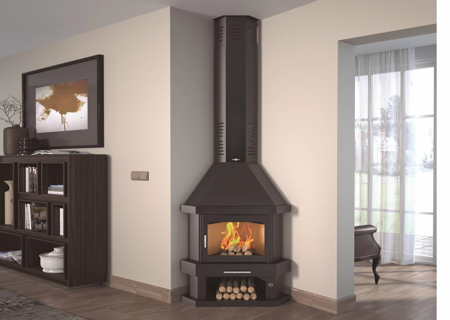 Diseño clásico con leñero, en el que se ha conseguido un gran aprovechamiento de su poder calorífico.