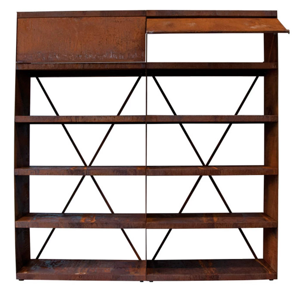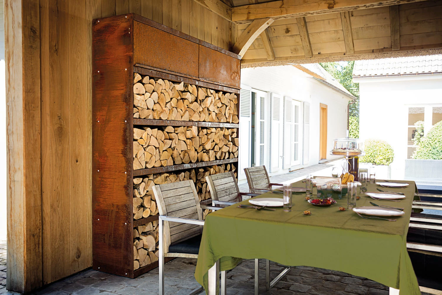 La estantería Leña Ofyr transforma un montón de madera en un elemento atractivo de la pared. En el estante de arriba, que tiene puertas abatibles, pueden guardarse herramientas y otros artículos de forma que no se vean.