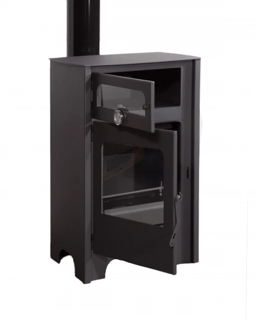 Estufa frontal de diseño muy actual fabricada en acero pintado en color gris oscuro. Puerta con cristal vitrocerámico. Leñero incorporado. Incluye un amplio horno, con termómetro de control.