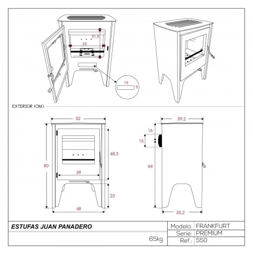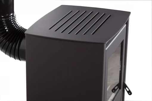 Estufa frontal de diseño muy actual fabricada en acero pintado en color gris oscuro. Puerta con cristal vitrocerámico. Leñero incorporado. Adaptada a la futura normativa europea Eco Design.