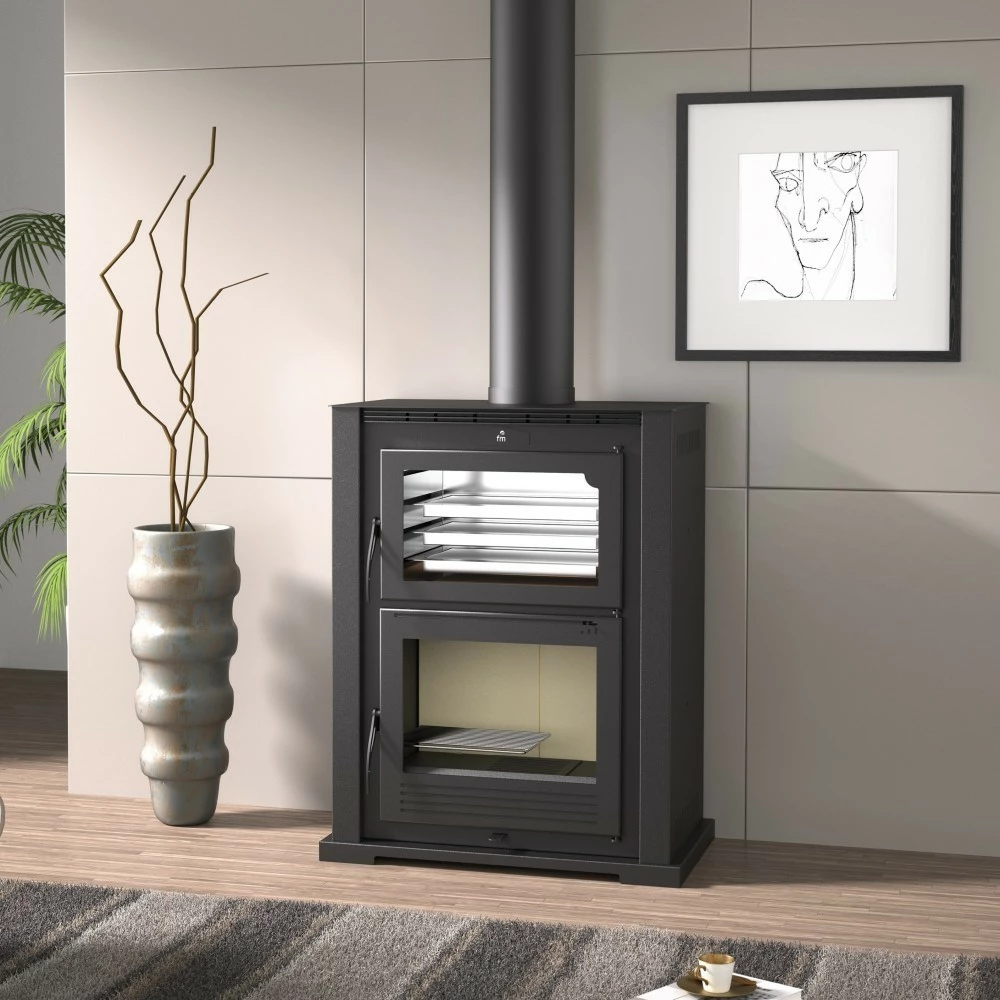 Diseño clásico, en el que se ha conseguido un gran aprovechamiento de su poder calorífico. Gracias a su hogar, recubierto de ladrillo refractario y su doble cuerpo que realiza la función de un convector natural de aire.