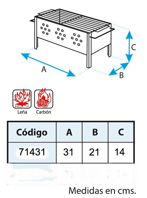 Se compone de un cuerpo construido en hierro forjado con pintura resistente al fuego hasta los 800 ºC y una parrilla de cocción cincada. La parrilla dispone de dos asas para poder retirarla muy fácilmente y acceder al combustible, igualmente el cuerpo también tiene mangos para transportarlo cómodamente.