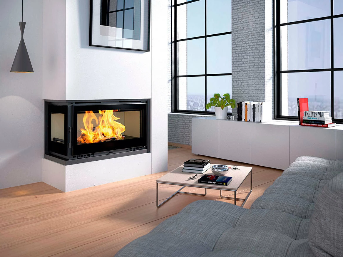 Magnífico insertable de leña, ideal para cualquier tipo de vivienda. Con una baja emisión de CO2 y un rendimiento superior al 70%, conseguimos un producto de alta calidad. También disponible con el cristal lateral orientado hacia la derecha.