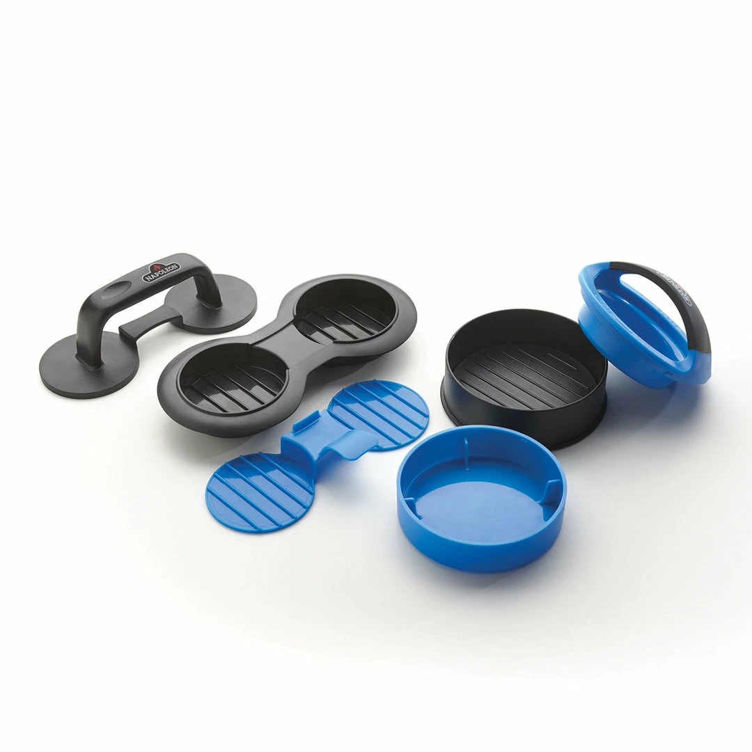 La tapa se desprende del mango para revelar una prensa más pequeña para que pueda hacer hamburguesas rellenas también, sellando perfectamente sus rellenos favoritos.