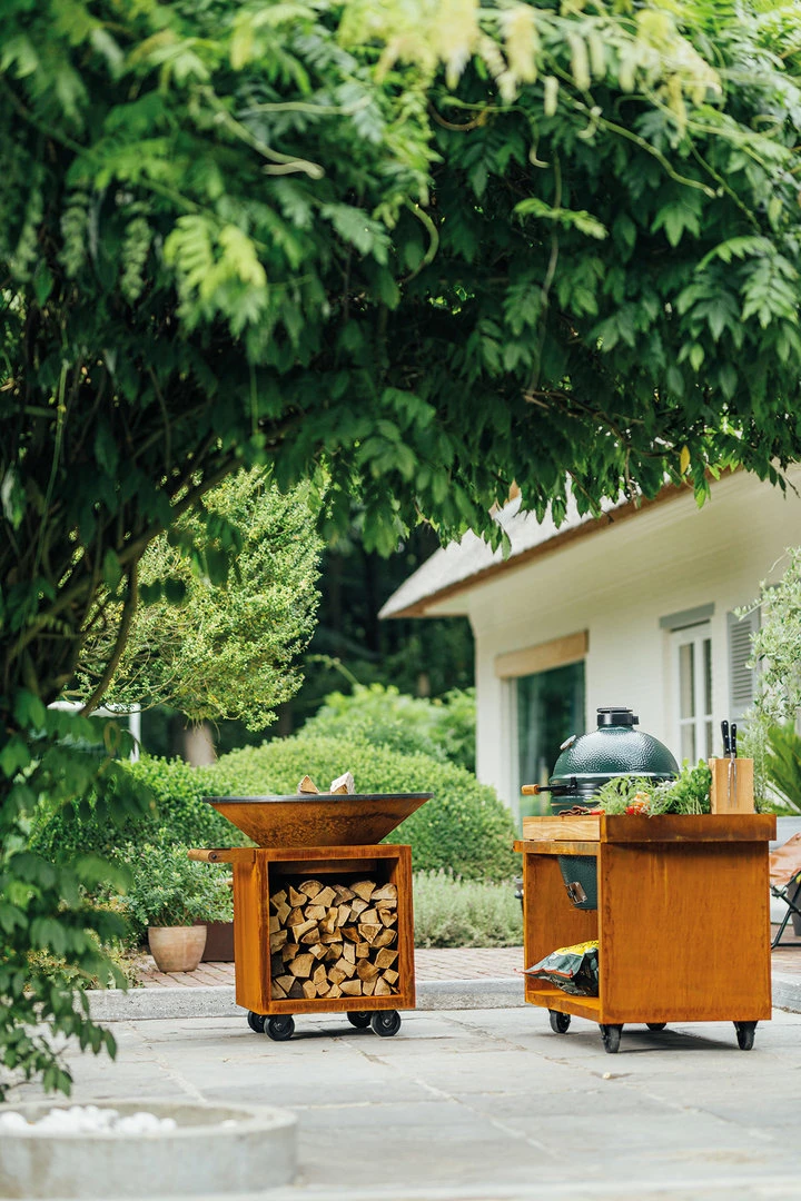 La Barbacoa de leña de diseño OFYR Classic Almacenaje Corten OCS-100-PRO tiene todas las características de OFYR Classic Almacenaje con la comodidad añadida de tener una agarradera y ruedas. Así, puedes mover fácilmente tu barbacoa de un lado a otro. La agarradera está hecha en madera de teca, por lo que es aconsejable guardar la OFYR Classic Almacenaje Corten PRO dentro o en una zona cubierta.
