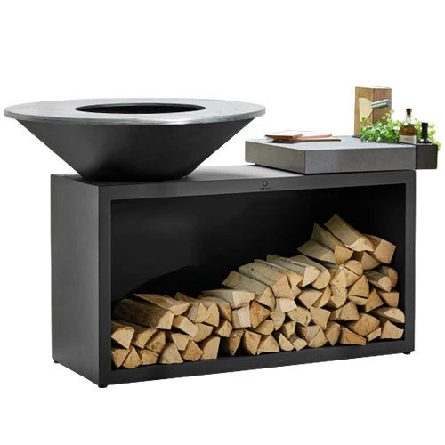 Esta unidad todo en uno combina un estilo y funcionalidades inmejorables en un diseño compacto. Fabricada en resistente Acero lacado en negro, incluye una unidad OFYR con espacio para guardar la leña, tabla de cortar de Cerámica y una práctica bandeja de accesorios para utensilios y condimentos. La Isla Ofyr es su completa cocina al aire libre.