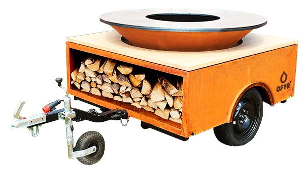 El OFYR Trailer es un remolque compacto equipado con un OFYR XL, superficies de trabajo prácticas y espacio de almacenamiento para leña. Cuenta con una superficie de cocción de 150 cm para que pueda ser utilizado sin problemas por dos chefs.