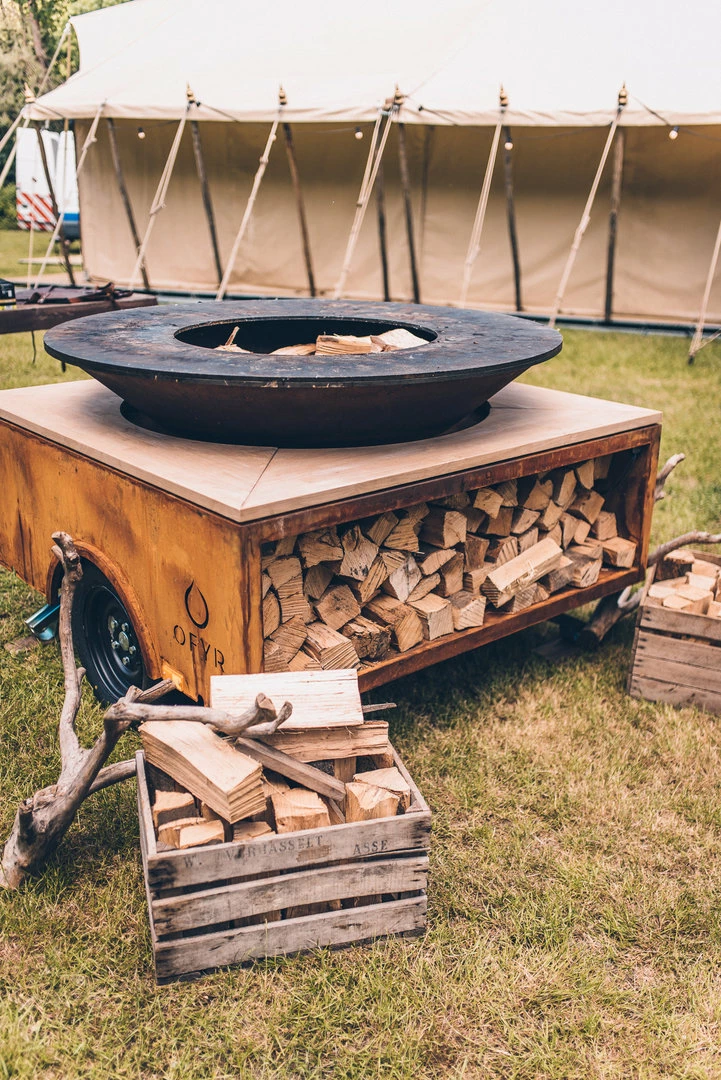 Las encimeras de madera están hechas de madera de caucho y son extraíbles. Hay espacio de almacenamiento para leña (± 0.5 m³) en la parte delantera y trasera del OFYR Trailer para que pueda llevarla fácilmente a cualquier evento. Además, tiene la madera a mano durante la cocción. En términos de funcionalidad, el trailer es, por lo tanto, una cocina completa para exteriores con el diseño exclusivo de OFYR.