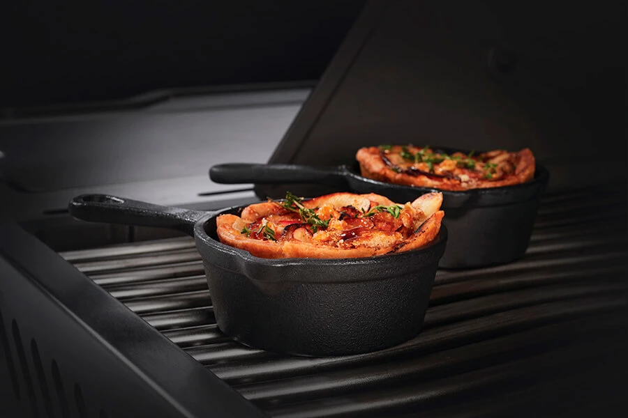 El hierro fundido robusto garantiza una distribución óptima del calor. La sartén tiene un borde extra alto y 2 prácticos caños. La sartén es práctica para utilizar en el quemador lateral de la barbacoa. Debido a las pequeñas dimensiones, se calienta en poco tiempo y produce resultados perfectamente uniformes.