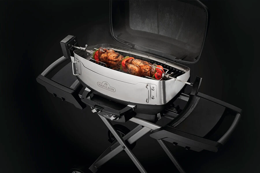 Prepara un pollo crujiente o una deliciosa pizza con este asador giratorio y horno para pizza especialmente diseñado para barbacoa portátil TravelQ de Napoleon. Este accesorio amplía el espacio de cocción debajo de la cuba de la barbacoa TravelQ y crea condiciones óptimas para una perfecta distribución del calor dentro del espacio de cocción.