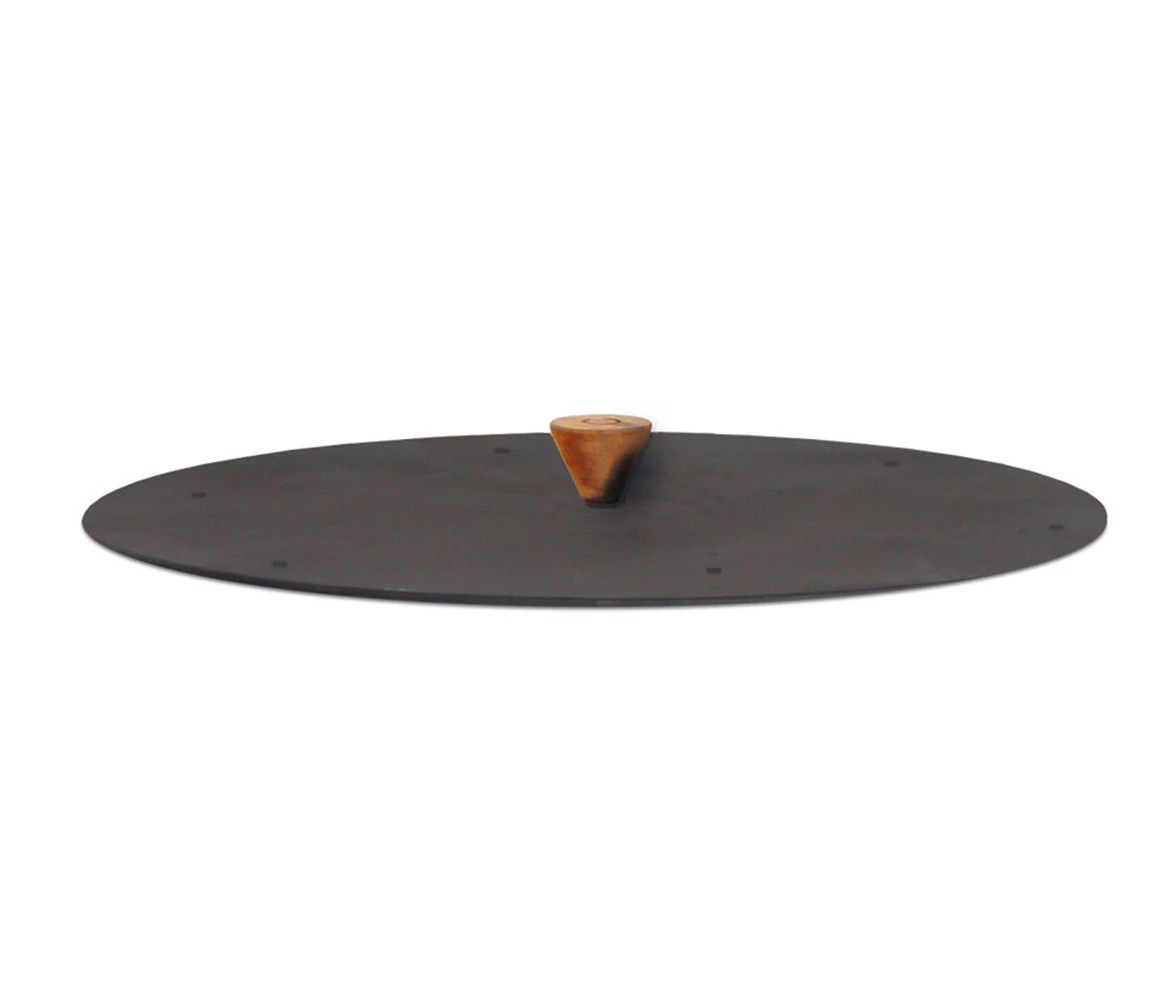 La Tapa Cubre Fuego Negro 100 cm está fabricada en Acero Lacado en negro y equipada con un Pomo Caoba. Con ella, puede apagar el fuego de su Barbacoa Ofyr de forma segura después de usarla. Esta tapadera tiene 6 abultamientos para evitar que se mueva al extinguir el fuego.