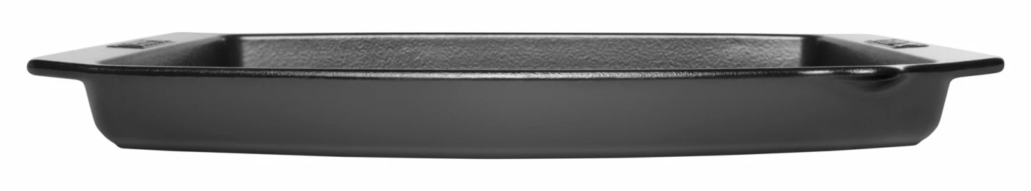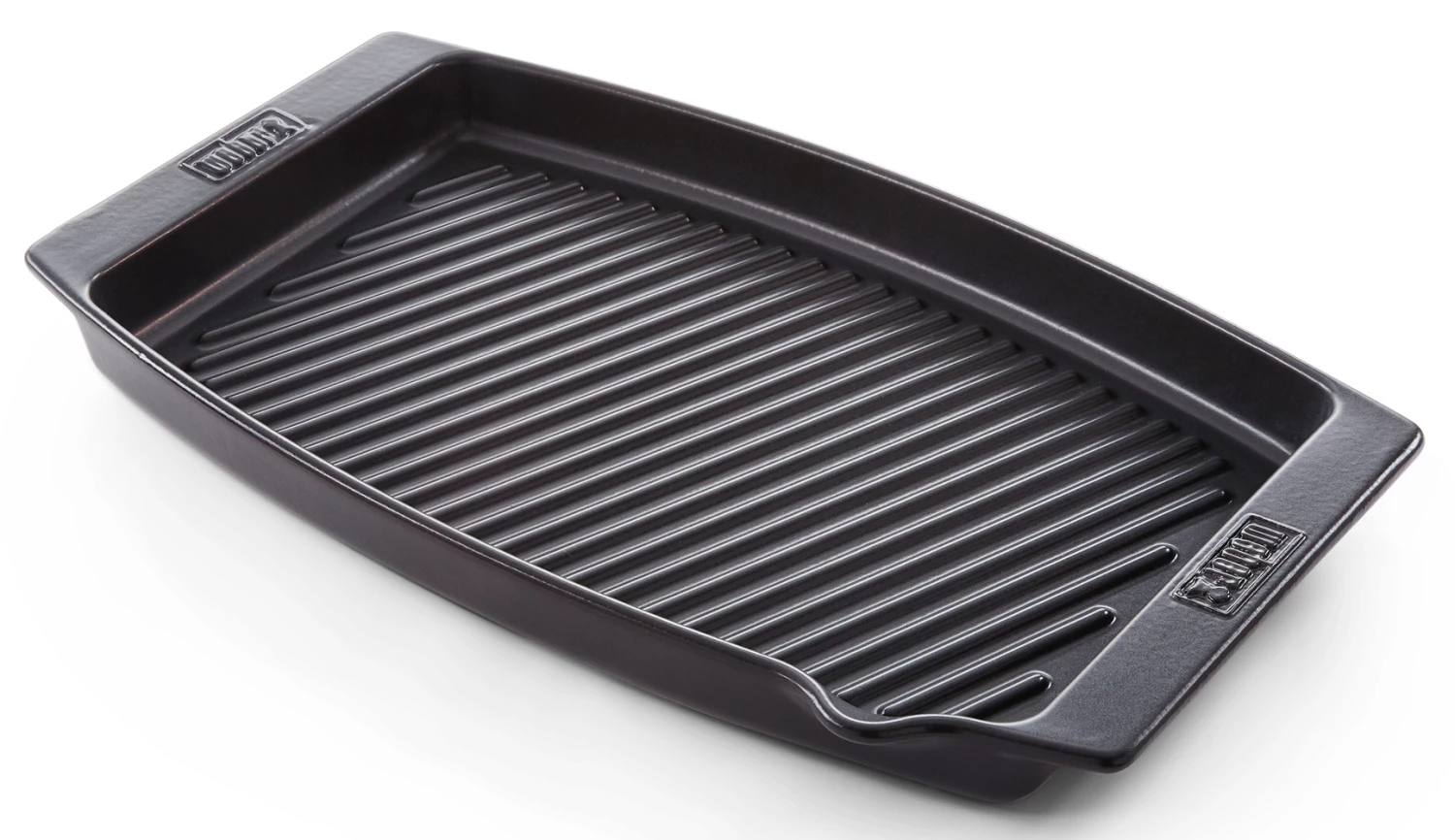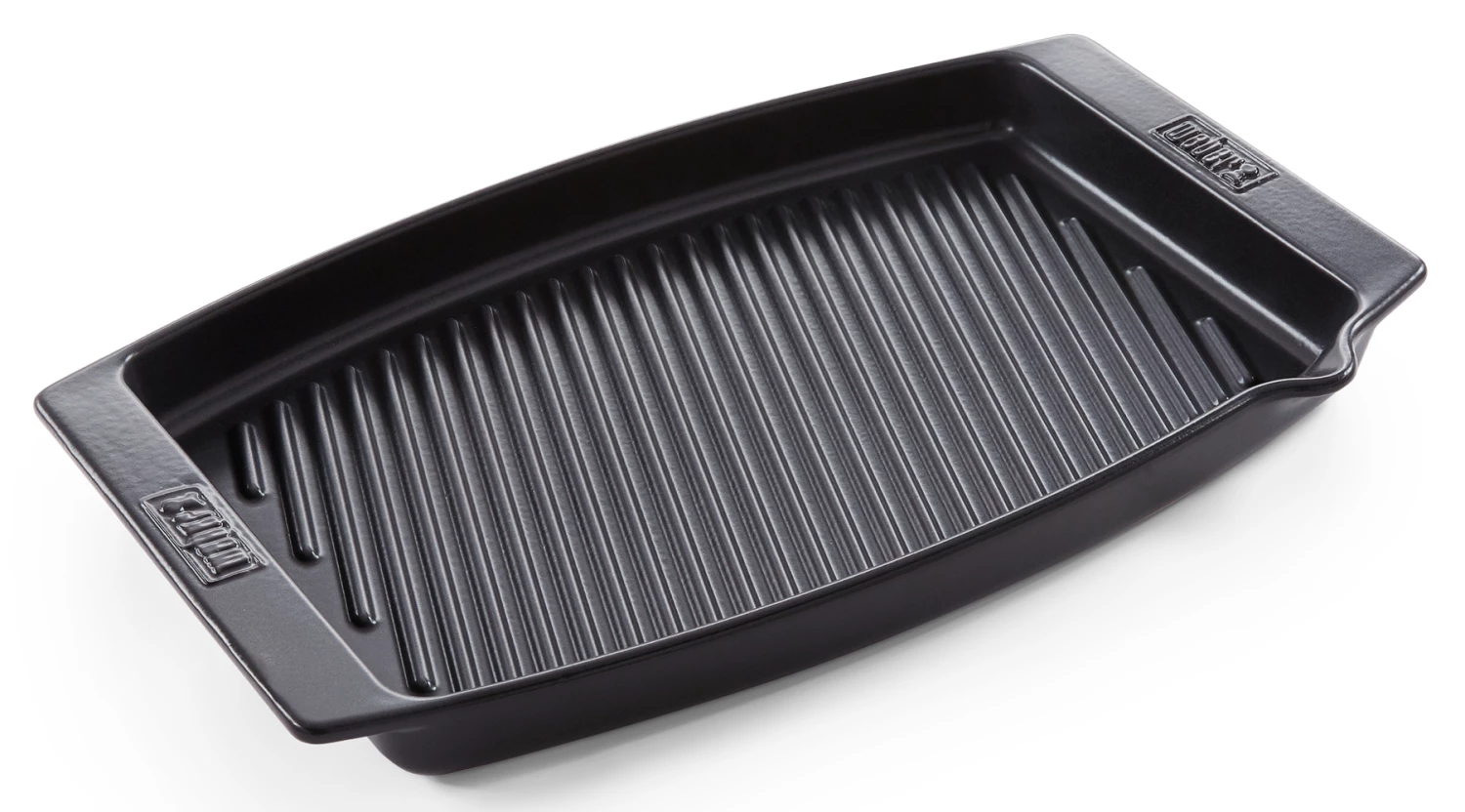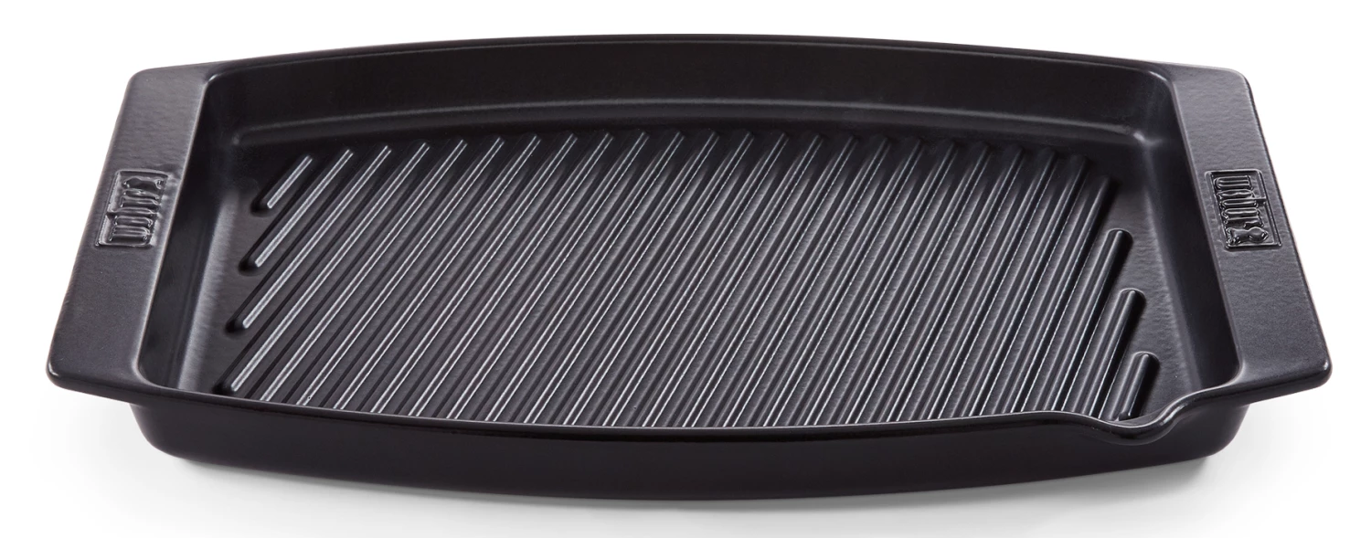 La bandeja para asar de cerámica es ideal para preparar y servir pescados, carnes, verduras y otros alimentos en porciones pequeñas que, de otro modo, no se sostendrían sobre las rejillas. El relieve del fondo de la bandeja es perfecto para imprimir marcas de parrilla en cortes de carne.